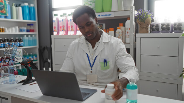 Young african american man working at a pharmacy store, examining medicine bottles and using a laptop while surrounded by various pharmaceutical products and healthcare items.