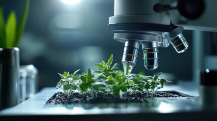 Scientist examining plant samples under a microscope in a laboratory on a bright afternoon