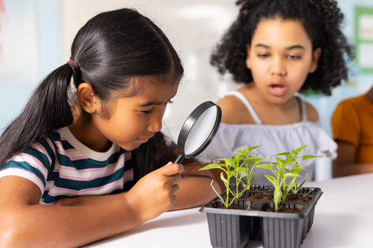 Diverse female child classmates examining seedlings with magnifying glass on white table at school