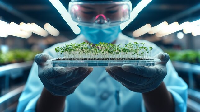 Scientist examining microgreens in a high-tech agricultural lab environment