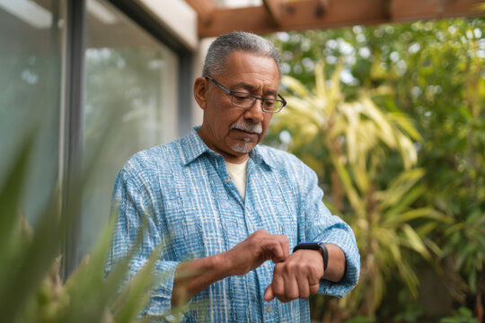 Senior man checking his smartwatch outdoors, standing near lush green plants and a modern house.  He's wearing a light blue patterned shirt and glasses. : Generative AI