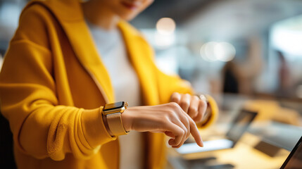 Shopper examining smartwatch features at modern electronics boutique faceless framing room gently defocused faceless background defocused wearable technology smart device