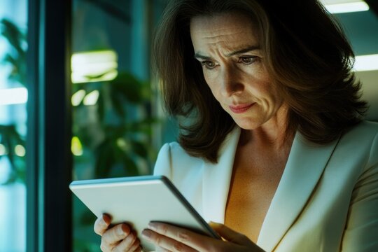 A person examining a tablet device, possibly checking emails or browsing the web