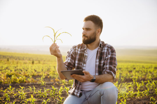 Agronomist examining corn sprout holding tablet in cultivated field at sunset
