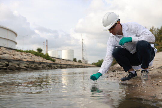 Ecologists in protective suits working near the oil refinery  and taking samples of water for analysis while examining science  to record on the tablet