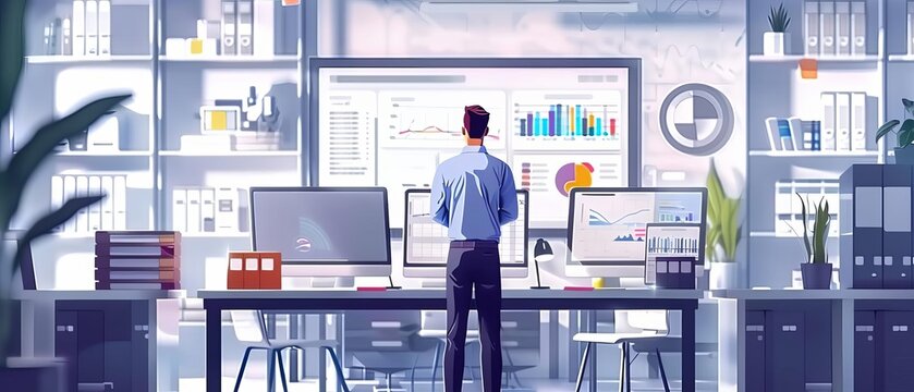 A professional analyst uses digital software and spreadsheets to present finance data, charts, and reports in a modern workplace.