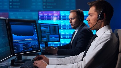 Team of brokers is working in office using workstation and analysis technology. Workplace of professional traders. Global financial markets, business strategy, currency exchange and banking.