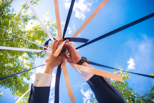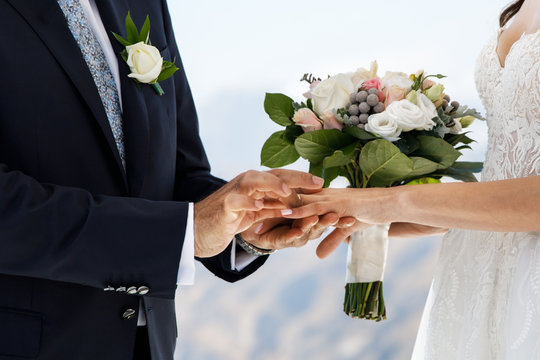 Marriage ceremony. The brides are exchanging wedding rings, the bride holds a wedding bouquet in her hand