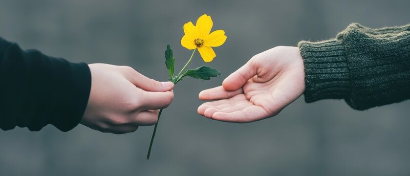 Two hands exchanging a yellow flower, symbolizing kindness and connection in a warm, gentle interaction.