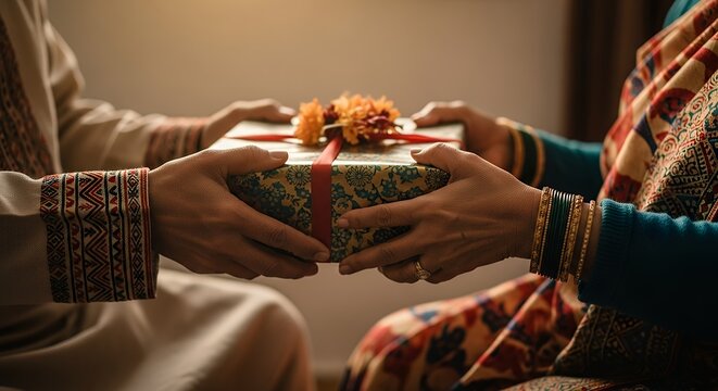 Close-up of hands exchanging a beautifully wrapped gift box adorned with flowers, symbolizing tradition and celebration.