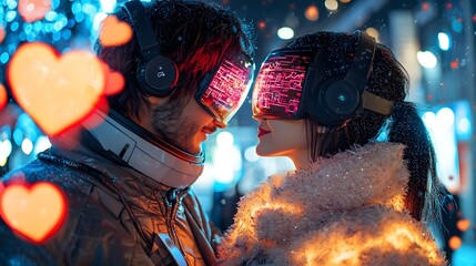 A couple wearing futuristic high tech attire exchanging digital love messages and embracing on Valentine s Day surrounded by a glowing