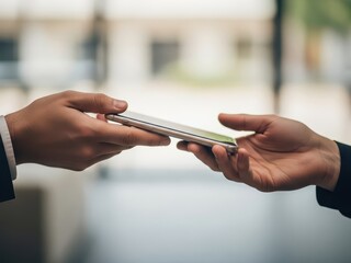 Two hands exchanging a smartphone with a blank screen, symbolizing communication and sharing.