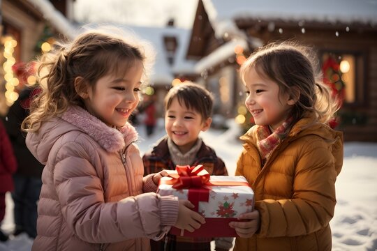 heartwarming photo of children eagerly exchanging gifts with big smiles on their faces with eye contact during a holiday gathering