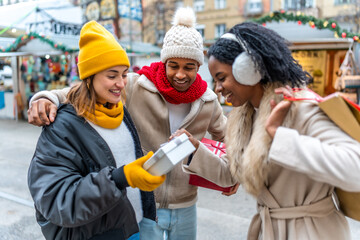 Celebrating holiday cheer with diverse friend group exchanging gifts