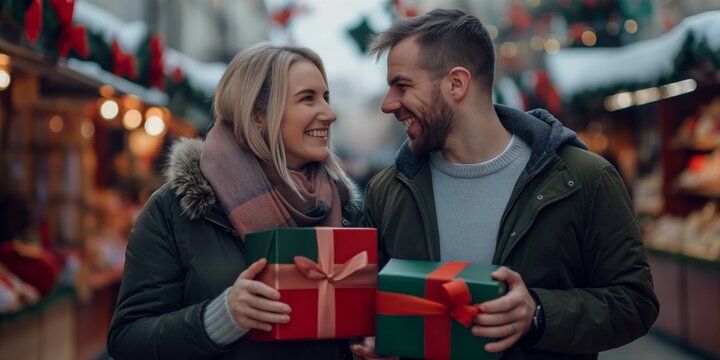 A festive couple is enjoying a holiday market, filled with Christmas gifts and exchanging joyful smiles. The atmosphere is warm and cheerful, celebrating the festivities of the season