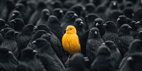 Yellow Bird Standing Out Among Black Birds Symbolizing Individuality and Society Exclusion