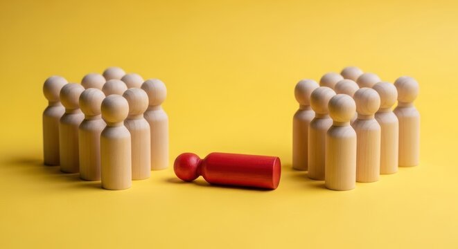Wooden figures separated by a fallen red figure on yellow background.