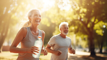 Senior couple is doing sport outdoors. Running in park in the morning.