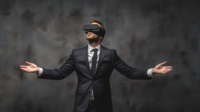 Businessman in Suit Experiencing Virtual Reality, Arms Spread Open, Dark Background. Embracing Innovation. AI