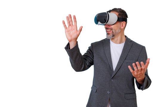 Mature man exploring metaverse with vr headset, interacting with virtual reality, embracing future technology, transparent background