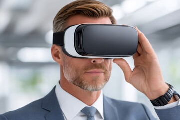 Businessman wearing VR headset in modern office setting.