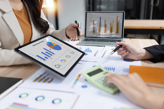 Finacial employee research tablet device. Businessman analyze charts in office.