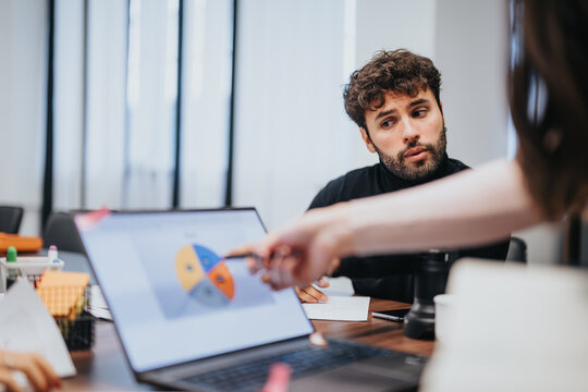 Engaged man attentively discussing pie charts during a business meeting. Colleagues collaborating in an office environment, sharing insights and strategies over a laptop.