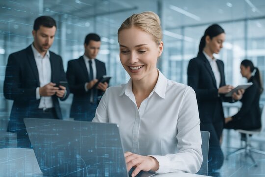 Smiling businesswoman working on laptop with team collaborating in modern office environment with futuristic digital interface overlay. Ai generative