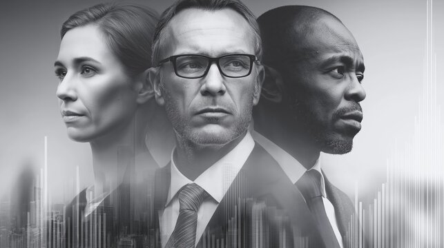 Monochrome Portrait of Business Professionals with Digital Data Overlay.