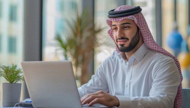 Arab businessman working on laptop with digital data projection in modern office