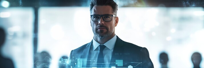 Confident executive stands in futuristic office, immersed in technology and strategic contemplation