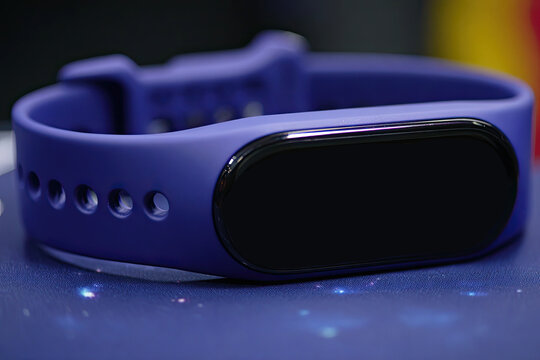 Mini Smart Watch. A purple fitness tracker with a sleek design, featuring a smooth black screen, rests on a textured surface, ideal for health and activity monitoring.
