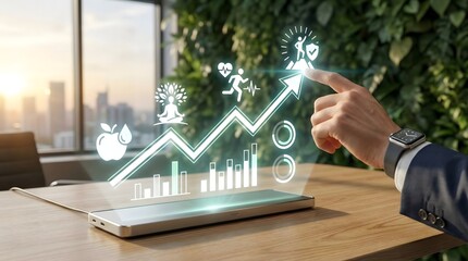 healthcare technology biotech biosensors, Wearable fitness tracker on arm with data display in background.