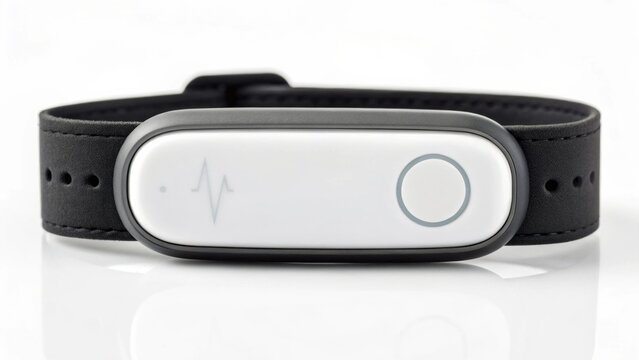 A sleek health monitoring wristband with a minimalist design, featuring a heartbeat symbol and a button for functionality.