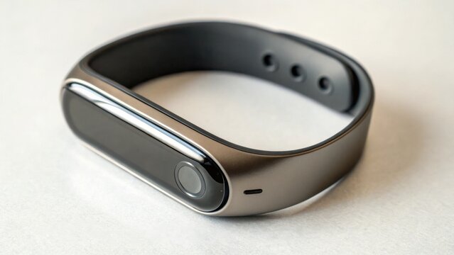 A sleek fitness tracker with a black band and touchscreen, designed for monitoring health and activity levels.