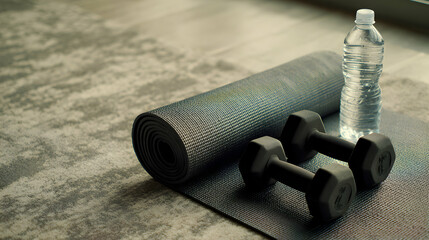 Fitness essentials for a healthy lifestyle with yoga mat and dumbbells