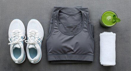 Mockup Workout essentials for a healthy and active lifestyle, White Sneakers, Grey Activewear, Green Smoothie, Yoga Mat, Fitness