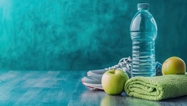 Fitness yoga mat water bottle towel exercise equipment wellness lifestyle essentials