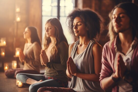 A community of women deep in meditation during a yoga class, Group of young people practicing yoga In the prayer position, AI Generated