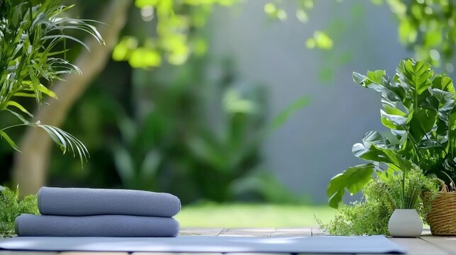 Calming Yoga Space Featuring a Soft Yoga Mat Complemented by a Towel and a Lush Basket of Vibrant Indoor Plants Creating a Tranquil Atmosphere