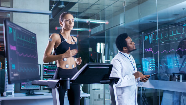 Man Wearing Brainwave Scanning Headset Sits in a Chair while Scientist Adjusts the Device. In the Modern Brain Study Laboratory Monitors Show EEG Reading and Brain Model.