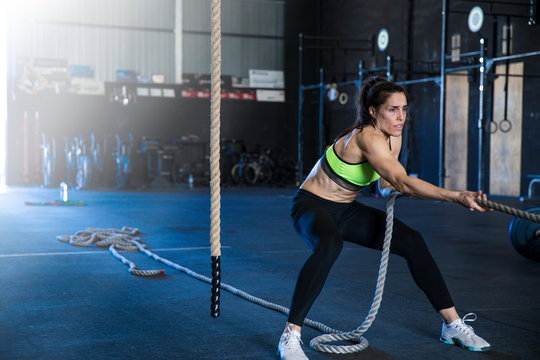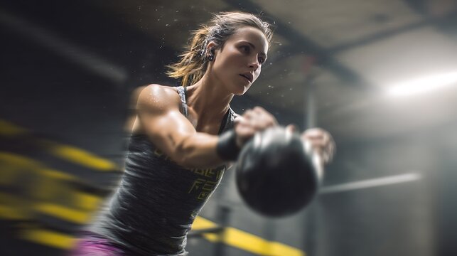 Athletic woman performing functional strength training with kettlebell in an industrial gym. High intensity workout, CrossFit, fitness motivation, healthy lifestyle, and strength conditioning concept.