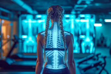 Close up of a female athlete training in a modern gym, with an x-ray scan overlay