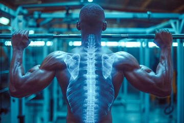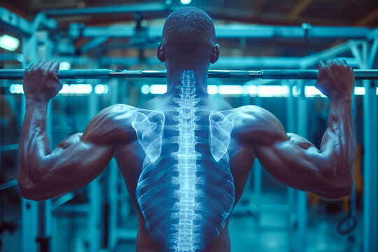 Close up of a male athlete training in a modern gym, with an x-ray scan overlay
