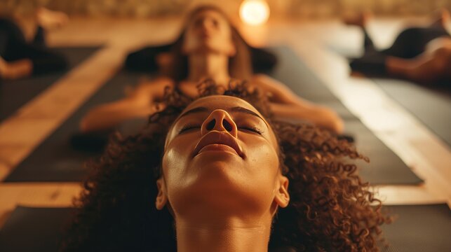Group of young people practicing yoga, lying with their eyes closed, doing savasana, corpse pose