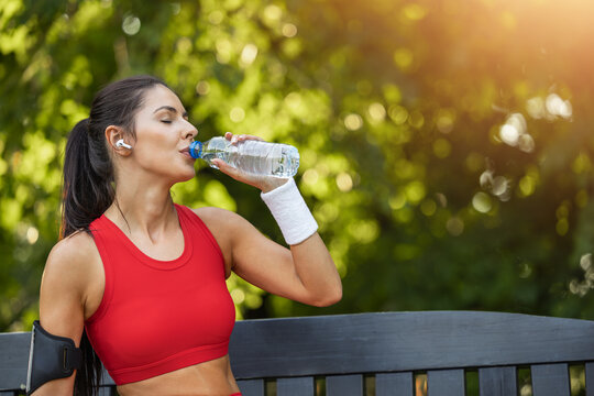 Woman enjoying a refreshing drink after workout in a park during a sunny day