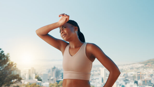 Tired, black woman and fitness with sweat in nature for workout, intense exercise or training. Active, female person or runner with recovery or rest for outdoor cardio, health or wellness on mountain