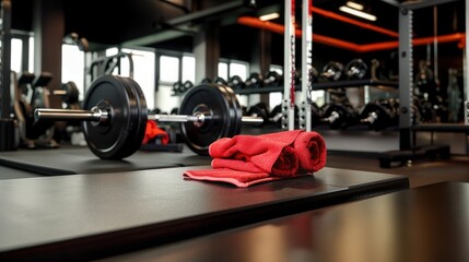 Weight lifting equipment on a wooden table in a gym filled with weights and exercise machines in a bright setting