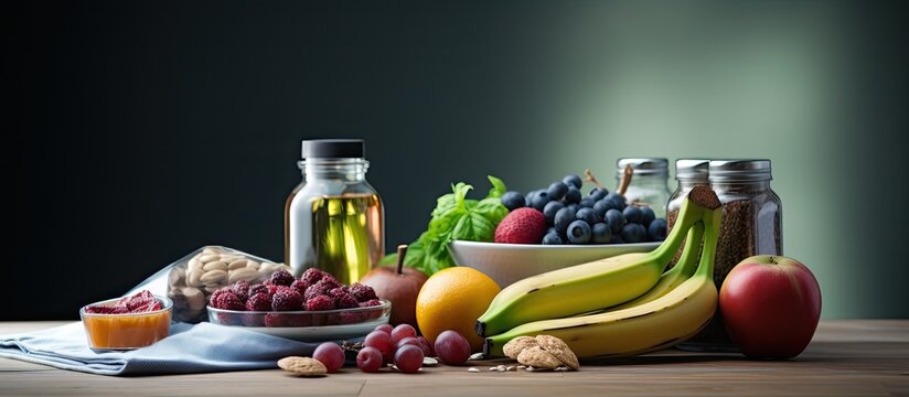 A fitness regimen comprising of exercise equipment and nutritious food is essential for a healthy lifestyle. Creative banner. Copyspace image