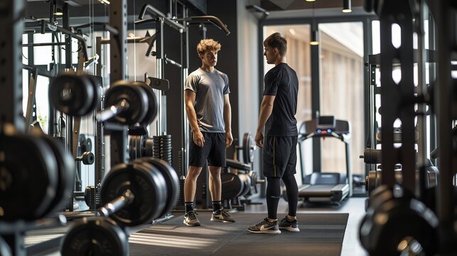 Two men are seen standing and talking in a gym environment, surrounded by various exercise equipment, indicating a consultation or discussion possibly related to fitness and training plans.